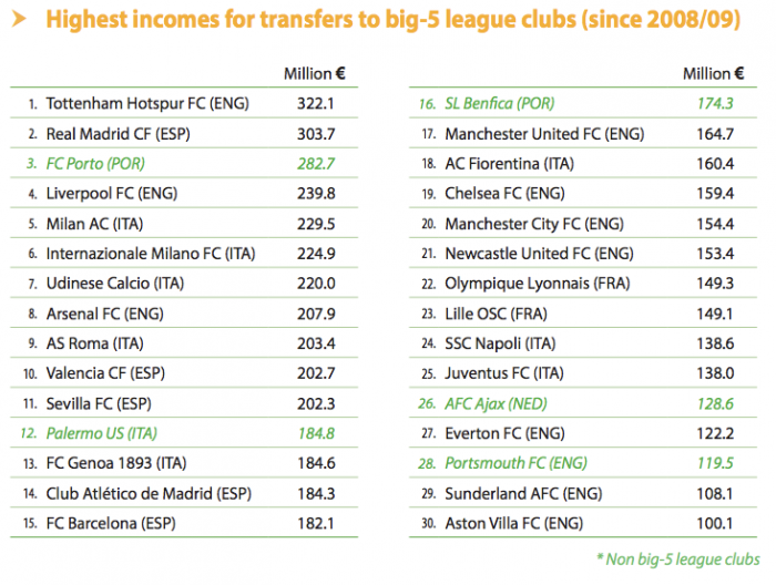 Реал се најде на второто место со заработка од 303,7 милиони евра, но за купување на нови играчи потрошија многу повеќе, додека на третото место е Порто (282,7) кој едно време беше прв кога станува збор за ова.