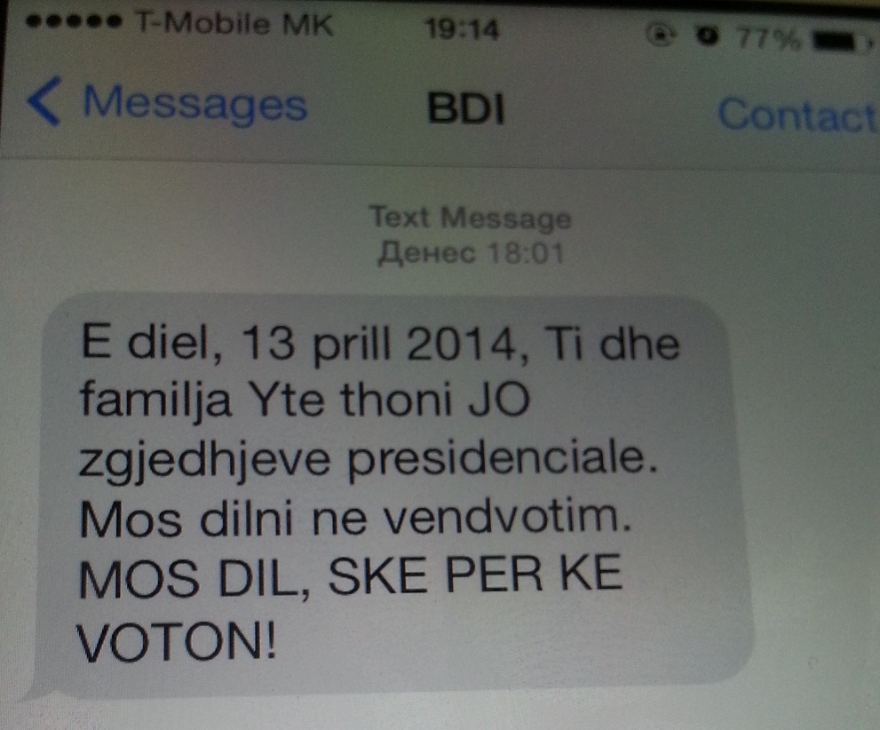 „Недела, 13 Април 2014, Ти и Твојата фамилија кажете им НЕ на преседателските избори. Не излегувајте да гласате, НЕ ИЗЛЕГУВАЈ, НЕМАШ ЗА КОГО ДА ГЛАСАШ! ”