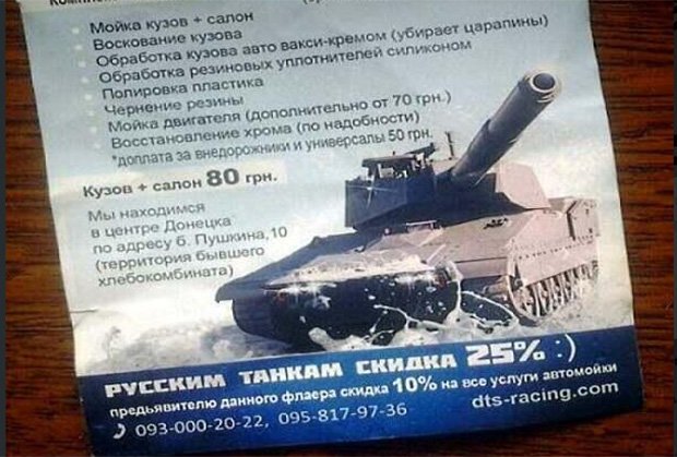 Досетливите жители на Донецк одлучиле да се пошегуваат и отпечатиле флаери за автопералница во која се дава попуст за миење на руските тенкови. Некој би рекол ништо посебно, се снашле во кризна состојба, но она што паѓа в очи е дека на руските тенкови кои многумина од жителите на Донецк со нетрпение ги очекуваат им се нуди 25 проценти намалување за миење во споменатата пералница.