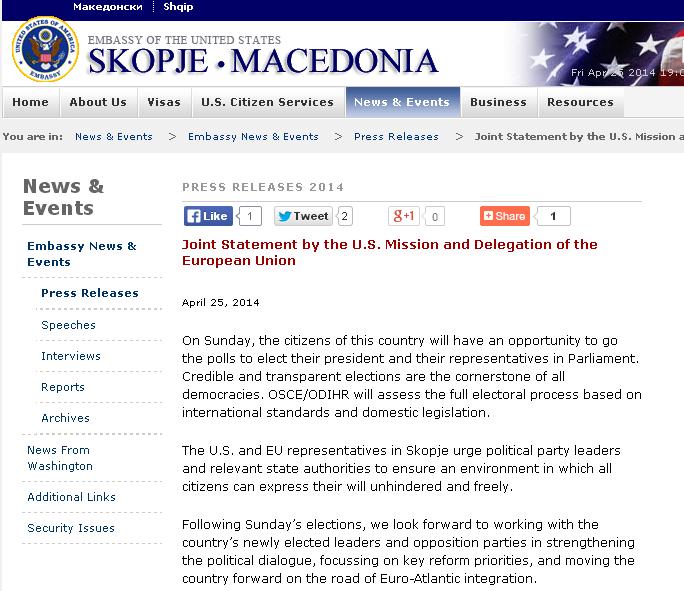 „По неделните избори се надеваме на соработка со избраните лидери од власта и опозицијата во зајакнување на политичкиот дијалог со фокусирање на главните реформски приоритети со што земјата ќе се придвижи напред на патот кон евроатлансктие интеграции“, се вели во обраќањето до јавноста потпишано од дипломатските претставници на САД и ЕУ во скопје.