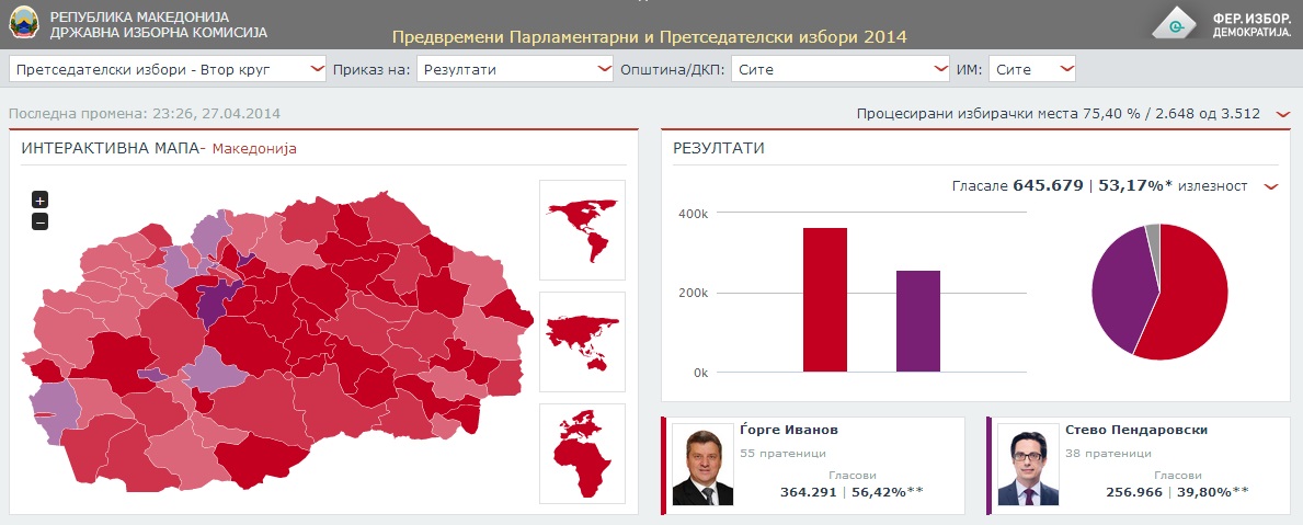 Според обработените 75,40 проценти од избирачките места, Државната изборна комисија објави дека кандидатот за претседател Ѓорге Иванов со освоени 364.291 гласа, 107.325 повеќе од неговиот противкандидат Стево Пендаровски, засега води во вториот круг на претседателските избори.