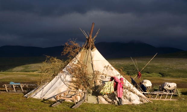 Dark clouds gather behind a reindeer herder’s tent as a Khanty woman hangs up her washing to dry at a camp in the Polar Ural Mountains. Yamal, Western Siberia, Russia.