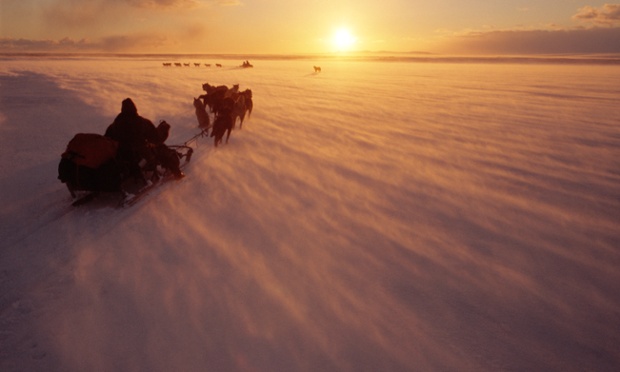 Chukchi hunters travelling from Uelen to Dezhnovka by dog sled on a windy November day. Uelen, Chukotka, Siberia.