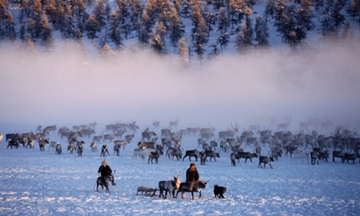 E’ven herders with their reindeer at their winter pastures near Verkhoyansk. Yakutia, Siberia, Russia.