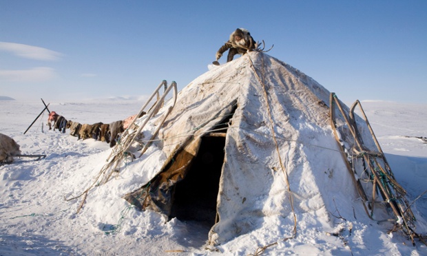 Natasha Nomro, a Chukchi woman, scraping snow from the top of her reindeer skin Yaranga at a herders’ winter camp on the tundra. Chukotskiy Peninsula, Chukotka, Siberia, Russia