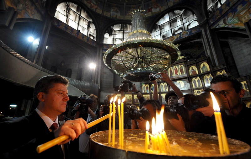 epa01689856 Newly elected Macedonian President Gjorge Ivanov (L) lights a candle at the orthodox church St. Kliment in Skopje, The Former Yugoslav republic of Macedonia on 06 April 2009. The runner of the ruling VMRO-DPMNE, Georgi Ivanov, won by a landslide on 05 April, after equally dominating the first-round vote two weeks earlier. He became the country?s fourth president since it split from former Yugoslavia nearly two decades ago. EPA/GEORGI LICOVSKI