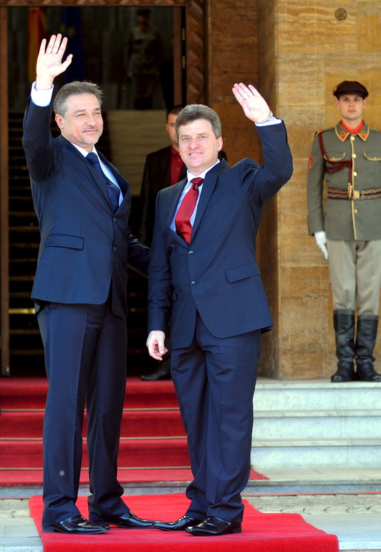 epa01727850 Outgoing President Branko Crvenkovski (L) and the new Macedonian President Gjorge Ivanov (R) wave to the journalist before the ceremony of inauguration in the Parliament in Skopje, The Former Yugoslav Republic of Macedonia on 12 May, 2009. Ivanov is the fourth elected Macedonian President. EPA/GEORGI LICOVSKI