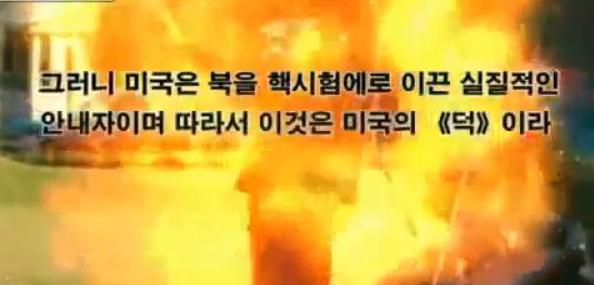 Во видео клипот за нуклеарната проба, која неодамна ја изврши Северна Кореја, вината се свалува на САД и нејзиното непријателско однесување, пренесува Скај њуз.