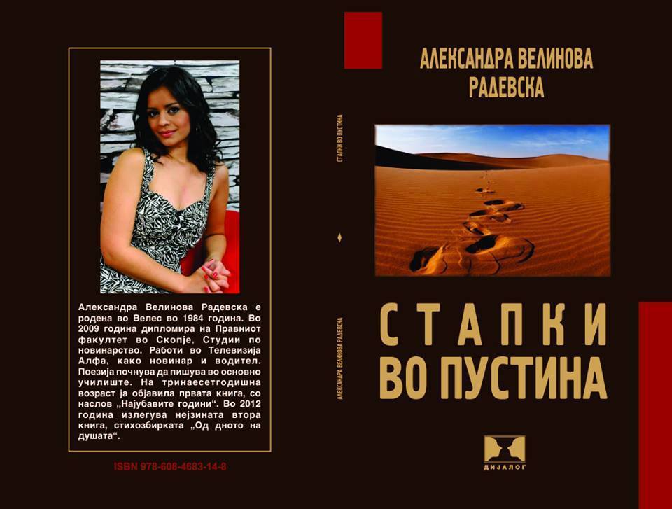 Во печат е втор тираж од книгата „Стапки во пустина“, најновата книга на Александра Велинова, во издание на „Дијалог‘‘, рецезент е проф.д-р Веле Смилевски, а беше промовира на Саем на книгата пре еден месец. Насловот е инспириран од песната Живот – Оаза, која е дел од оваа стихозбирка во која љубителите на поезијата ќе прочитаат социјална, психолошка и, пред сè, лирска поезија. Инспирацијата за книгата е од секојдневни општествени случувања, народни поговорки, а една од поентите е како да се ставиме над сите проблеми со кои се соочуваме. Ова е трета книга на Велинова, по„ Најубавите години ‘‘објавена на 13-годишна возраст и „Од дното на душата‘‘ во 2002 година, која беше испечатена во два тиража со оглед интересот што го предизвика.
