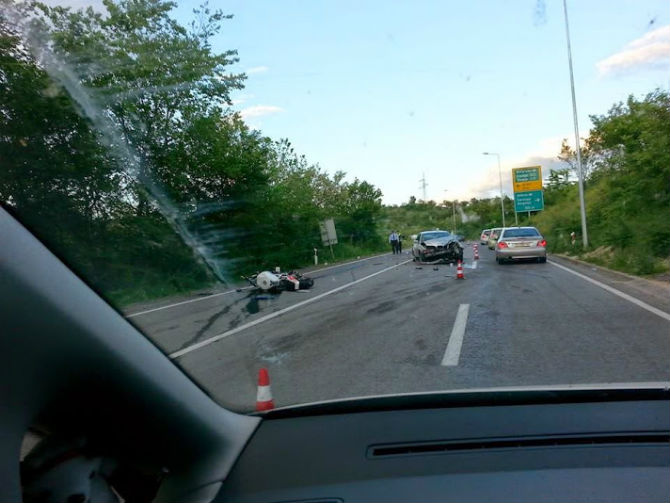 Тешка сообраќајна несреќа се случи попладнево на излезот од Велес, каде што патничко возило од марката „бмв“ се судри со мотоцикл, пренесува екипата на Телеграф.мк, која случајно се најде на местото.