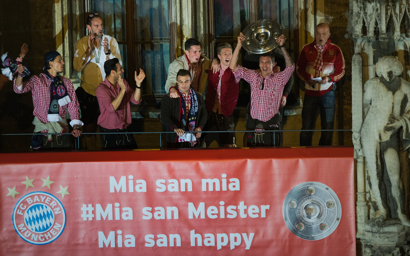 epa04200263 (L-R) Daniel van Buyten, Tom Starke, Claudio Pizarro, Xherdan Shaqiri, Pierre-Emile Höjbjerg, Mitchell Weiser and Mario Mandzukic celebrate with the trophy as the German FC Bayern Munich soccer team appears on the balcony of the City Hall at the Marienplatz Square where they were cheered by thousands supporters, in Munich, Germany, 10 May 2014. FC Bayern Munich is the German Bundesliga Champion for the 2013/14 season. EPA/PETER KNEFFEL