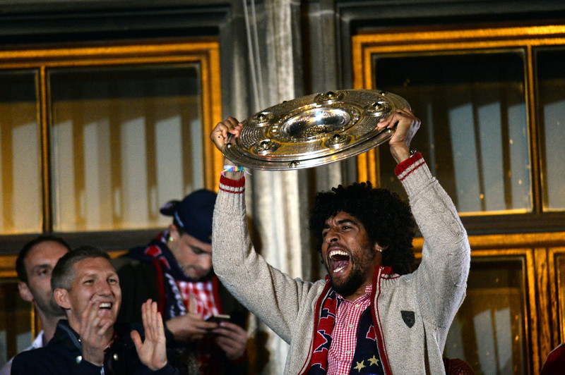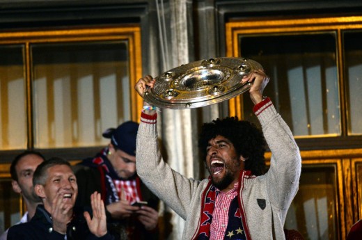 epa04200262 Munich’s player Dante (R) celebrates with the trophy as the German FC Bayern Munich soccer team appears on the balcony of the City Hall at the Marienplatz Square where they were cheered by thousands supporters, in Munich, Germany, 10 May 2014. FC Bayern Munich is the German Bundesliga Champion for the 2013/14 season. EPA/NICOLAS ARMER