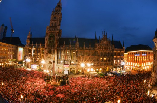 epa04200181 Thousands of FC Bayern Munich supporters gather in Marienplatz in Munich, Germany, 10 May 2014, to celebrate the German Bundesliga Championship for the 2013/14 season. EPA/PETER KNEFFEL