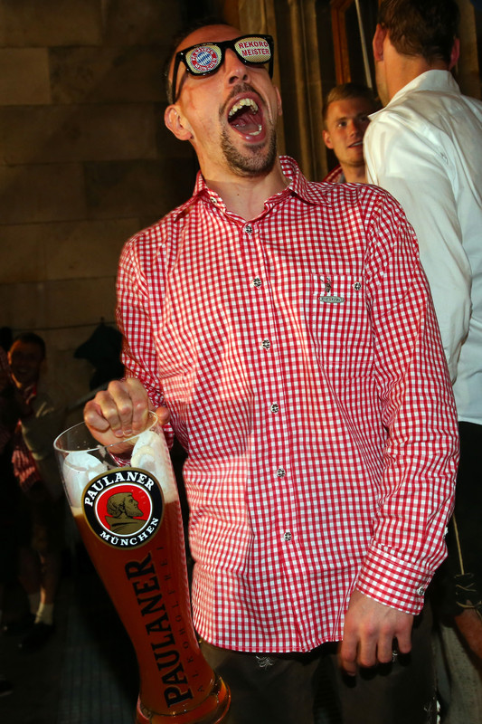 epa04200784 Bayern Munich’s French midfielder Franck Ribery grips the rim of huge glass of beer while wearing glasses to mark the occasion on the balcony of the Town Hall in Marienplatz, Munich late 10 May 2014 as he and team members celebrate winning the title. EPA/Alexander Hassenstein .