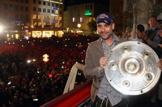 epa04200780 Josep ‘Pep’ Guardiola, the Spanish coach of Bayern Munich shows off the German Championship shield from a balcony of the Town Hall in Marienplatz, Munich late 10 May 2014 as he and team members celebrate winning the title. EPA/Alexander Hassenstein .