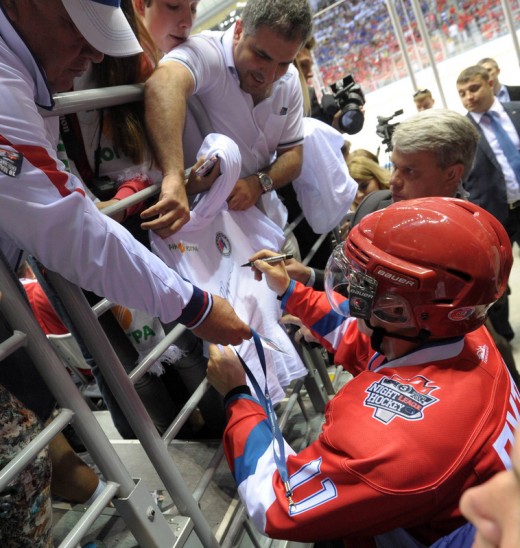 epa04199677 Russian President Vladimir Putin (R) gives autographs prior to a gala ice hockey match between Russian amateur players and ice hockey stars during the Night Hockey league tournament in the Black Sea resort of Sochi, Krasnodar region, Russia, 10 May 2014. During the match Vladimir Putin scored six goals. EPA/ALEXEY DRUGINYN / RIA NOVOSTI / KREMLIN POOL MANDATORY CREDIT