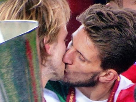 На фотографијата се играчот на Севилја, Иван Ракитиќ, кој со сочен бакнеж се поздрави со неговиот соиграч Даниел Карико.
