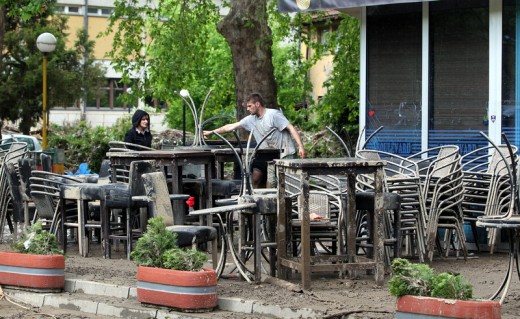 epa04212366 Workers clean the garden in front of a restaurant after flooding in the town of Maglaj, in Bosnia and Herzegovina, 18 May 2014. A state of emergency has been declared in Bosnia and Herzegovina due to severe floods caused by rain falling for several days. EPA/FEHIIM DEMIR