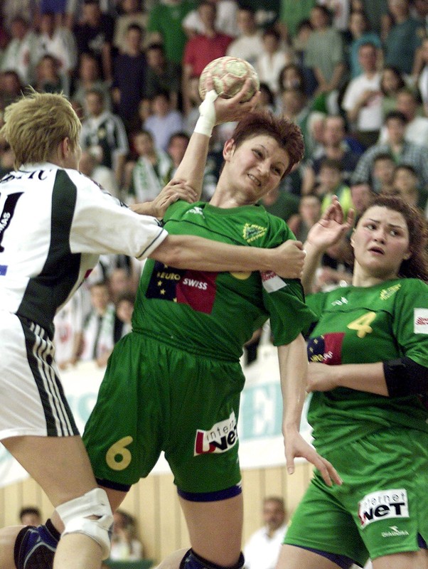 BUD02 – 20020511 – BUDAPEST, HUNGARY: One of the best scorers, Macedonian player Olga Buyanova (C) of Kometal Skopje scores a goal for her team as Hungarian defender Agnes Farkas (L) of Herz-FTC tries to stop her as Macedonian player Anzela Platon (R) reacts, in the local sport hall , Saturday 11 May 2002, during the first leg of women Champions League final handball match . Hungarian team won 27-25.