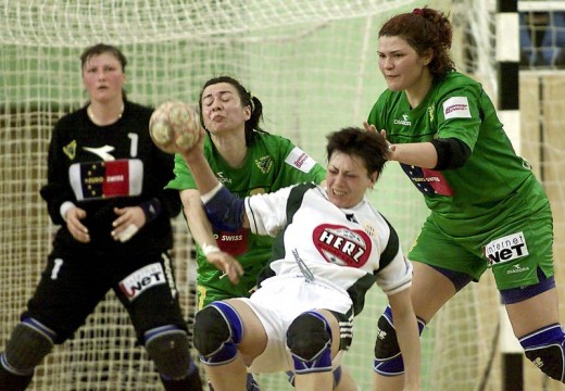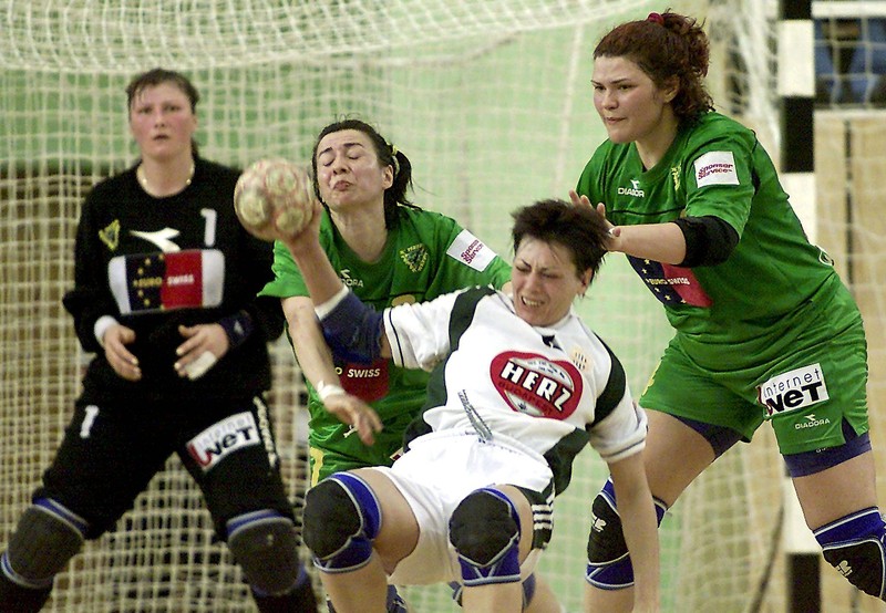 BUD03 – 20020511 – BUDAPEST, HUNGARY: Macedonian defenders Irina Kalinichenko( C) of Kometal Skopje and Anzela Platon (R) push their Hungarian opponent Ildiko Padar (R2) of Herz-FTC on Saturday11 May 2002 during the first leg of the champions league final match in Budepest. Hungarian won 27-25. (L: Macedonian player Luminita Dinu). EPA PHOTO ATTILA KISBENEDEK/AK