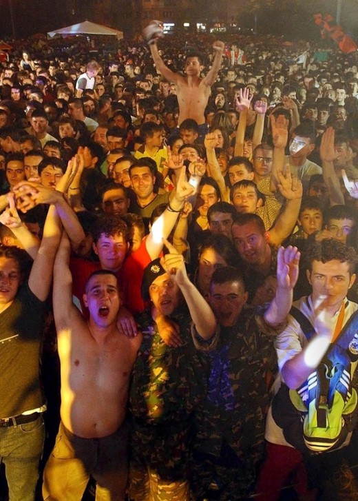 SKO06 – 20020519 – SKOPJE, MACEDONIA: Thousands of handball enthusiasts and supporters of Kometal celebrate in Skopje on Sunday 19 May 2002 after Kometal won the women’s European Hanball League final against Hertz FTC from Hungary. Kometal defeated Hertz FTC by 26-22 in Skopje. EPA PHOTO EPA / ROBERT ATANASOVSKI / GL fob