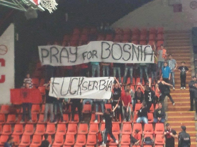 Срамен транспарент на кошаркарски натпревар во Гостивар истакнаа група хулигани, а на него пишува: „Се молиме за Босна, кој ја е.е Србија“.