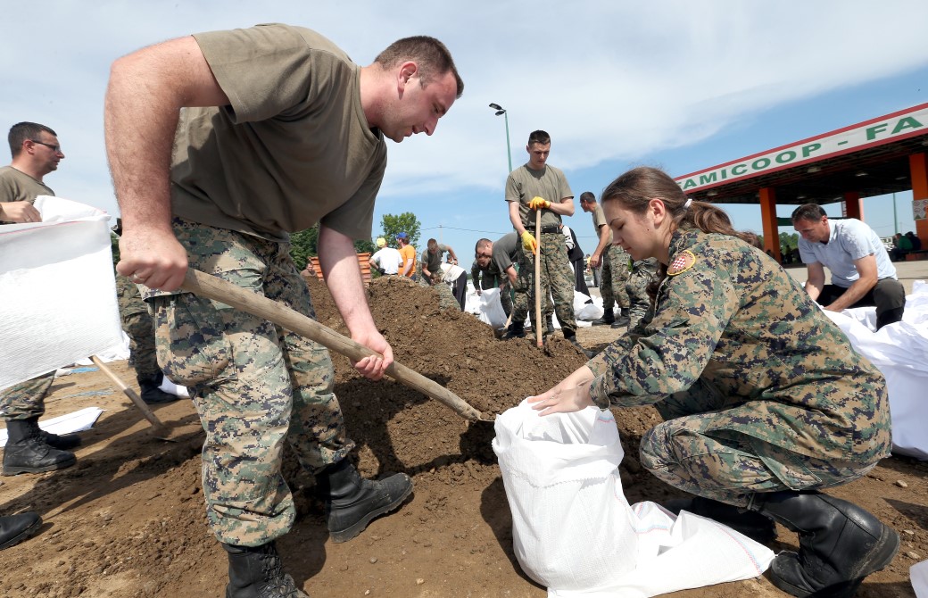 epa04215437 Bosnian soldiers prepare sandbags for flood protection in the city of Orasje, 250 km from the capital of Bosnia, Sarajevo, 20 May 2014. A state of emergency has been declared in Bosnia and Herzegovina due to severe floods caused by rain falling for several days. Thousands of people in Bosnia, Serbia and Croatia were evacuated late 19 and early 20 May 2014 as rising floodwaters swallowed homes and farmland after last week’s record rains. EPA/FEHIM DEMIR