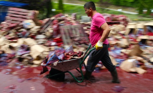 epa04215887 A man moves a pushcart through the red-coloured waters as people are cleaning refrigerators with raspberries, destroyed during the floods in Pozega, 200km south-west of Belgrade, Serbia, 20 May 2014. A state of emergency has been declared in Serbia due to severe floods caused by rain falling for more than 48 hours. Thousands of people in Bosnia, Serbia and Croatia were evacuated as rising floodwaters swallowed homes and farmland after last week’s record rains. At least 20 people have drowned in Bosnia, and several people are missing. Another 20 people have been killed in Serbia. EPA/DRAGAN KARADAREVIC