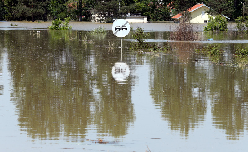 epa04217273 A traffic sign is partly submerged on a flooded road in the city of Brcko, northeastern Bosnia and Herzegovina, 21 May 2014. A state of emergency has been declared in Bosnia and Herzegovina due to severe floods caused by rain falling for several days. Emergency services in Bosnia and Herzegovina, Croatia and Serbia continued to fight to keep a series of swollen rivers under control and remained on high alert for possible new flooding, even as authorities warned the worst dangers had receded. EPA/FEHIM DEMIR