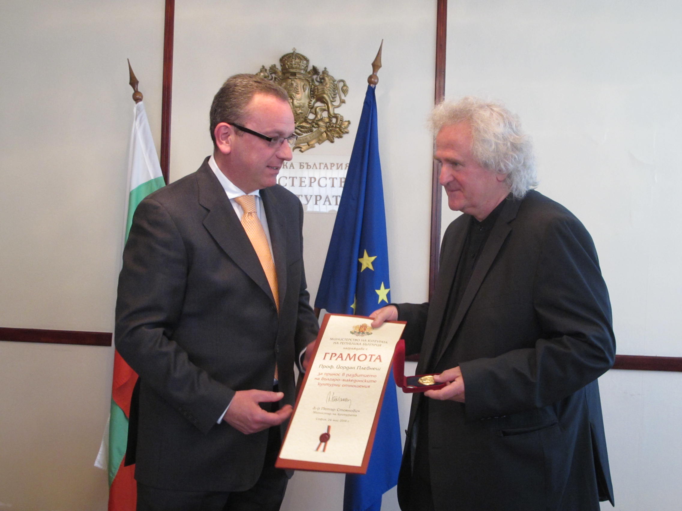 На свеченоста, којашто денес (23 мај 2014) беше приредена по тој повод, со присуство на врвни имиња од бугарскиот јавен живот и култура, меѓу кои актерите Рени Врангова и Стојан Алексиев, режисерот Александар Морфов и академскиот сликар Светлин Русев, во свечената сала Колегиум, наградата ја додели министерот за култура на Р. Бугарија, Петар Стојанович.