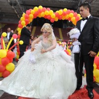 Младоженците чекореа по црвен килим минувајќи под срциња од балони каде според традицијата, невестата изведе бавен танц.