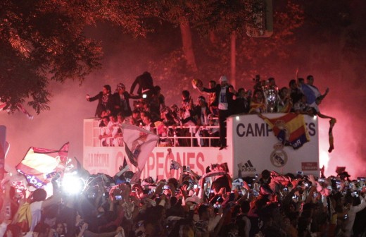 epa04223713 Real Madrid players ride on a bus as they celebrate with their fans their 10th UEFA Champions League Trophy after winning the final against Atletico Madrid, at the Cibeles square in Madrid, Spain, early 25 May 2014. EPA/ZIPI