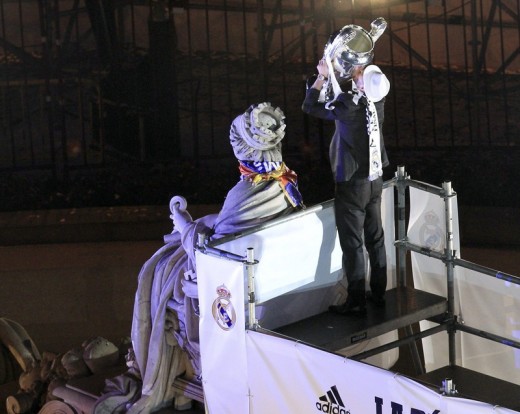 epa04223675 Real Madrid’s defender Sergio Ramos kisses the trophy over the Cibeles statue at Cibeles Square in Madrid, central Spain, early 25 May 2014. The Real Madrid won 4-1 against the Atletico Madrid in their UEFA Champions League final match played at Luz Stadium in Lisbon, Portugal on 24 May 2014. EPA/ALBERTO MARTIN