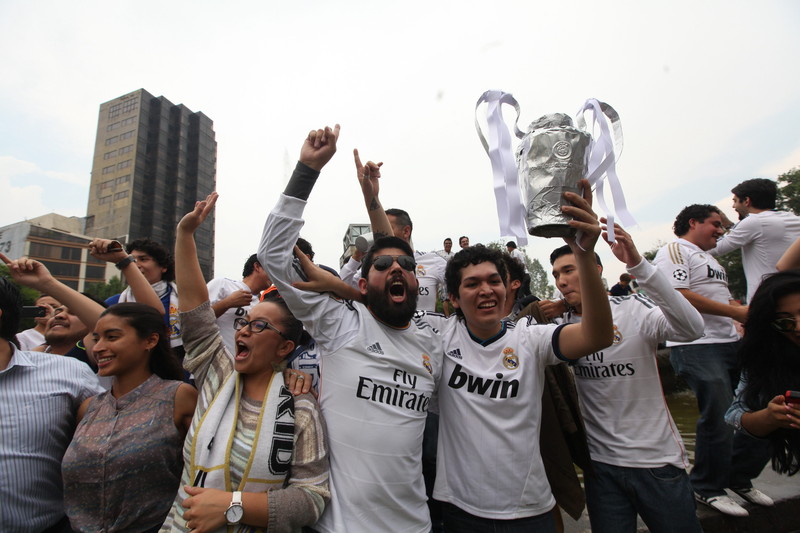 epa04223606 Spanish supporters of the Real Madrid based in Mexico celebrate the victory of their team over the Atletico Madrid in their UEFA Champions League final match, at the Cibeles fountain in Mexico City, Mexico, 24 May 2014. Real Madrid won 4-1 against the Atletico Madrid in their final match played at Luz Stadium in Lisbon, Portugal on 24 May 2014. EPA/SASHENKA GUTIERREZ