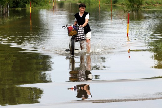 epa04222340 A woman pushes a bicycle on a flooded street as she leaves from her submerged home in the city of Orasje, in the northern part of Bosnia and Herzegovina, some 250 kilometers from the capital Sarajevo, 24 May 2014. As the waters from the worst flooding the Balkans has seen in more than a century subside and the destruction is assessed, the threat of disease is now one of the biggest concerns for authorities. Left behind are cadavers and plumbing, along with stagnant puddles and lots of mud, all of which could be infested with dangerous parasites and bacteria. EPA/FEHIM DEMIR