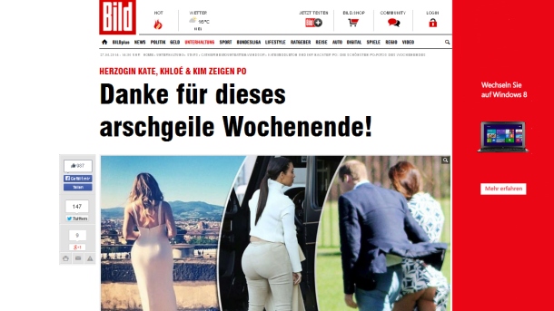Војвотката од Кембриџ, Кејт Мидлтон повторно е на насловните страници, но овој пат со малку поинаква фотографија. Германскиот таблоид „Билд“ објави фотографија на која ѝ се гледа голиот задник.