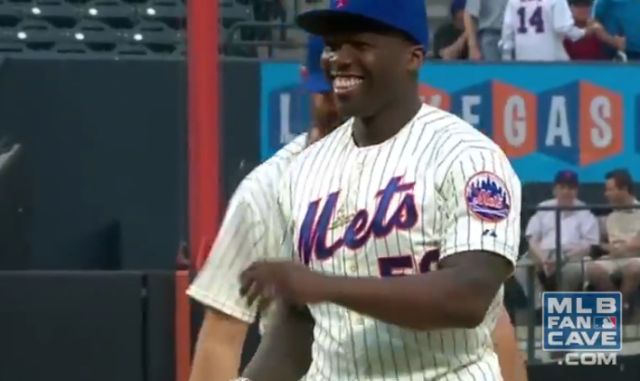 Раперот Фифти Сент имаше чест свечено да го отвори натпреварот на Њујорк Мец со првото фрлање.