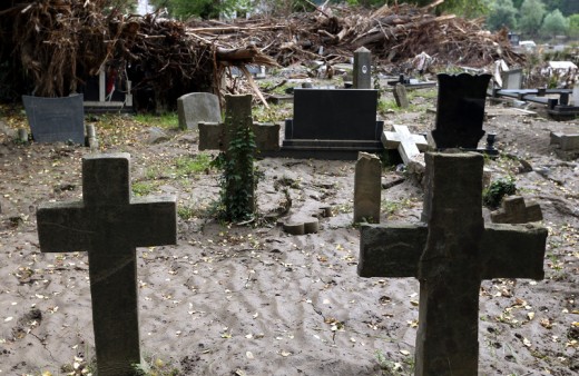 epa04230713 A heap of garbage lies on the ground in the Orthodox cemetery after flooding in the Bosnian town of Maglaj, 150 kms from Sarajevo, Bosnia and Herzegovina, 29 May 2014. Flooding struck Bosnia-Herzegovina, Croatia and Serbia after record rainfall over three days. EPA/FEHIM DEMIR