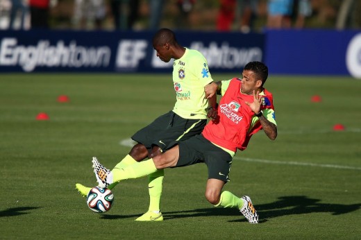 epa04239999 Brazilian national soccer teamґs players Ramires (L) and Daniel Alves (R) during a training session at Granja Comary, in Teresopolis, Rio de Janeiro, Brazil, 04 June 2014. EPA/Marcelo Sayao