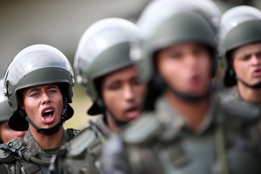 epa04245554 Brazilian Army Forces present their defense and security troops for the FIFA World Cup Brazil 2014 in Brasilia, Brazil, 08 June 2014. Around 3700 soldiers and more than 300 Army vehicles for troops transport will guarantee the security of Brasilia during the tournament, which will start on 12 June 2014. EPA/Fernando Bizerra Jr.