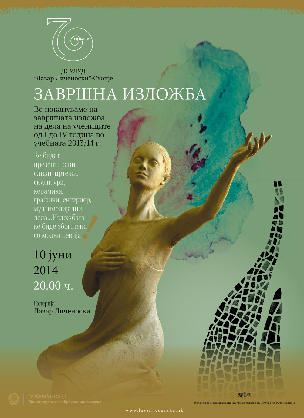 Како дел од одбележувањето на јубилејот утре во 20 часот, во училишната галерија „Лазар Личеноски“, ќе биде отворена Годишната завршна изложба на која ќе бидат претставени слики, скулптури, графики, керамики, цртежи, мултимедијални дела, видеа, ентериер и дополнително изложбата ќе биде збогатена со модна ревија на одделот за Текстил и облека. Атмосферата ќе биде дополнета со музички настап на ученици од ДМУБУЦ „Илија Николовски-Луј“.