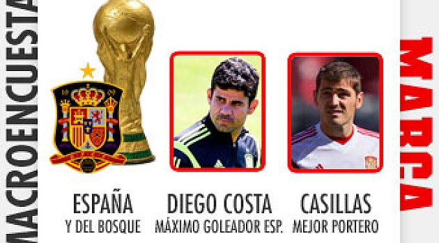 Реномираниот шпански весник „Марка“ направи анкета непосредно пред стартот на Светското првенство во Бразил, а читателите очекувано и дадоа предноста на својата репрезентација во битката за нова планетарна титула. Според посетителите на сајтот на „Марка“ Шпанија ќе го одбрани трофејот од 2010, а „црвената фурија“ ја доби довербата на 36,6 проценти на учесниците во анкетата.
