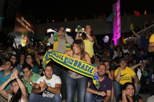 epa04252899 Lebanese fans wave Brazilian flags while watching on a giant screen the FIFA World Cup 2014 group A preliminary round match between Brazil and Croatia at the FIFA Fan Fest in Zeytouna bey in Beirut, Lebanon 12 June 2014. EPA/NABIL MOUNZER
