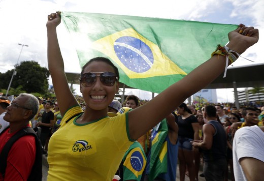 epa04252760 A Brazilian fan cheers while watching the FIFA World Cup 2014 group A preliminary round match between Brazil and Croatia at the FIFA Fan Fest in Manaus, Brazil, 12 June 2014. The FIFA World Cup 2014 will take place in Brazil from 12 June to 13 July 2014. EPA/MAST IRHAM