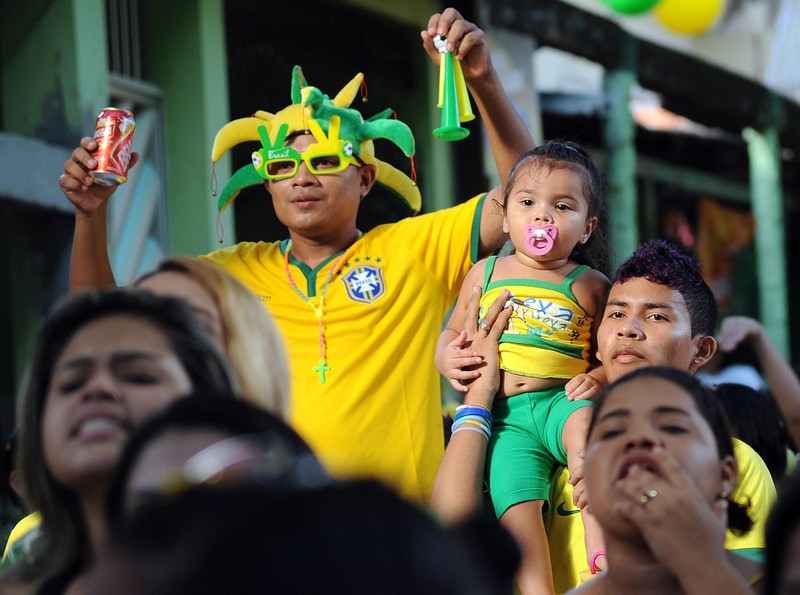 epa04252749 Supporters of Brazil cheer at the Fan Fest in Manaus, Brazil, 12 June 2014, watching the FIFA World Cup 2014 group A preliminary round match between Brazil and Croatia. EPA/DANIEL DAL ZENNARO