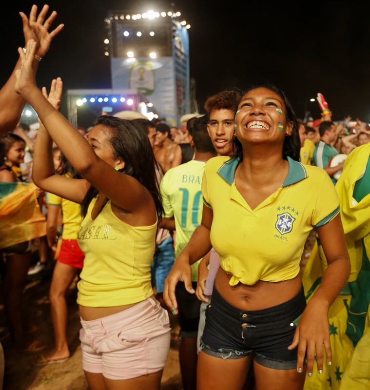 epa04252928 Fans celebrate while watching the FIFA World Cup 2014 group A preliminary round match between Brazil and Croatia at the FIFA Fan Fest in Natal, Brazil, 12 June 2014. The FIFA grWorld Cup 2014 is taking place in Brazil from 12 June to 13 July 2014. EPA/KAMIL KRZACZYNSKI
