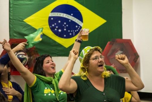 epa04252998 Supporters watch the FIFA World Cup 2014 opening game between Brazil and Croatia on TV, in a pub close to the Arena Corinthians stadium, in Sao Paulo, Brazil, 12 June 2014. EPA/Aaron Cadena Ovalle