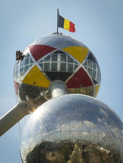 epaselect epa04253278 Team of workers decorate the top sphere of the Atomium with the Belgium national colours ahead of the FIFA World Cup 2014 match in Brazil, in Brussels, Belgium, 13 June 2014. Belgium is part of Group H of FIFA World Cup 2014 and will play its first match against Algeria on 17 June. EPA/OLIVIER HOSLET IMAGE TO BE USED ONLY IN CONTEXT WITHIN REPORTS ABOUT THE ATOMIUM BEING DECORATED IN BELGIAN NATIONAL COLOURS DURING THE FIFA WORLD CUP 2014 IN BRAZIL.