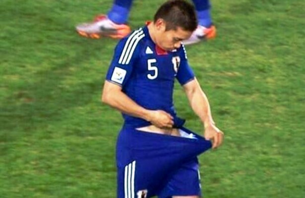 Фотографија од мечот Јапонија- Брегот на Слоновата Коска одигран синоќа е вистински хит на социјалните мрежи. Левиот бек на Јапонците и играч на италијански Интер, Јуто Нагатомо проверува дали “алатот“ му е на место по жестоките дуели со африканските фудбалери.