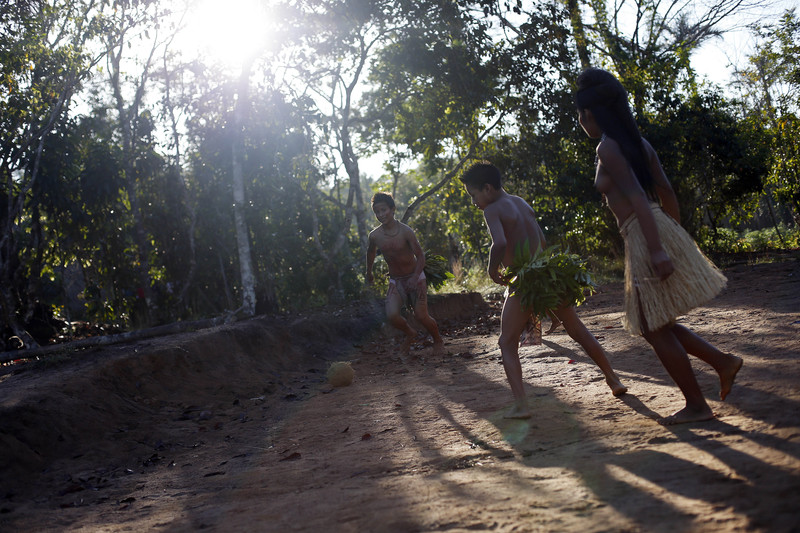 epa04260001 Indian Tatuyo kids play soccer at Tupe village outskirt of Manaus, Amazon region, Brazil, 15 June 2014. Manaus will host the FIFA World Cup 2014 group A preliminary round match between Cameroon and Croatia on 18 June 2014. EPA/MAST IRHAM